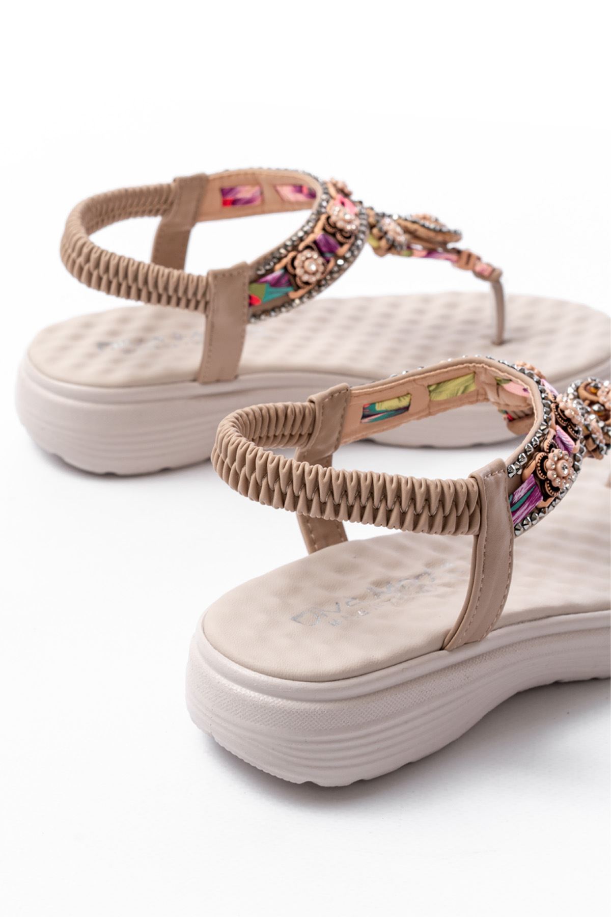 DM-609 Bej Taşlı Arka Lastikli Parmak Arası Kadın Sandalet