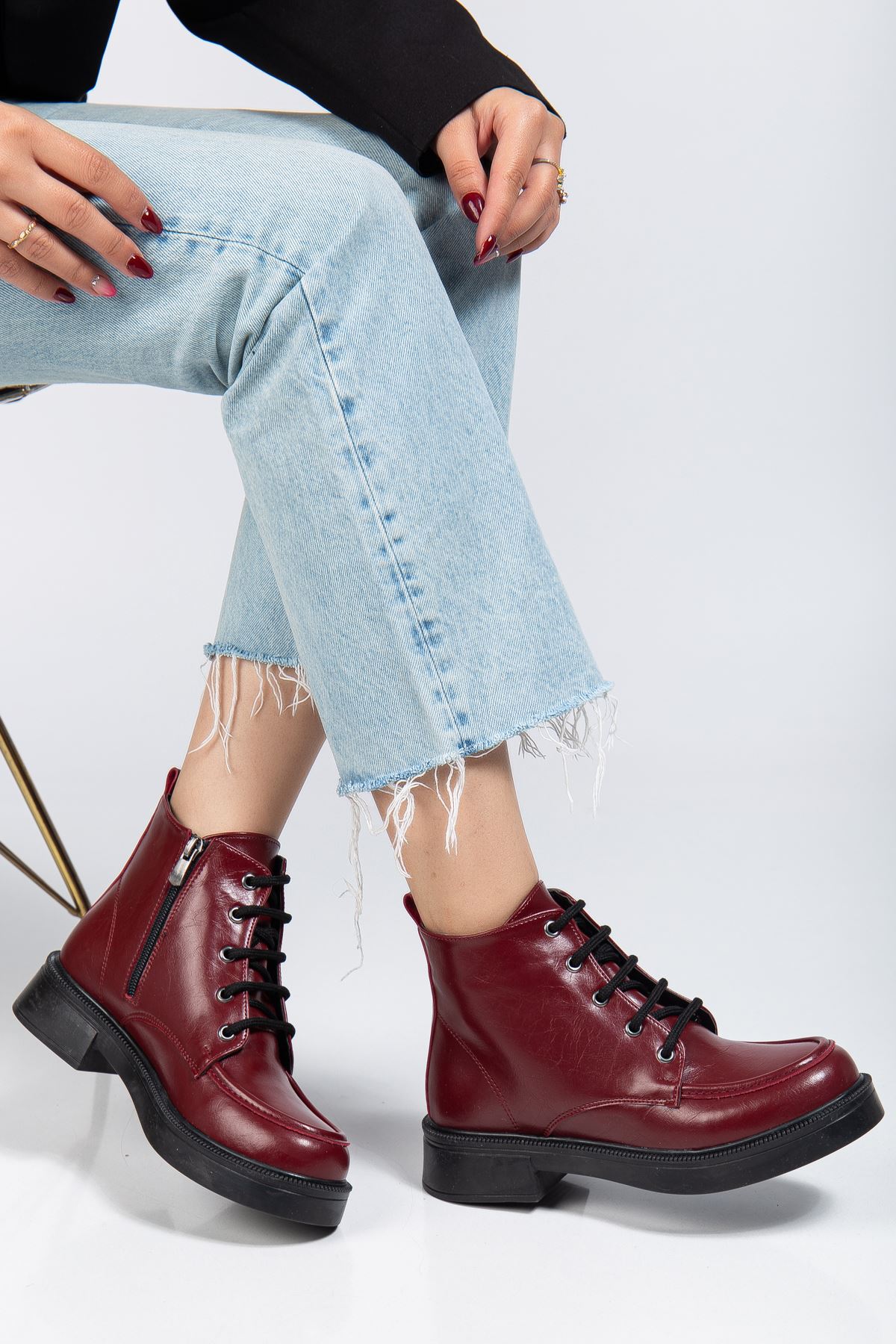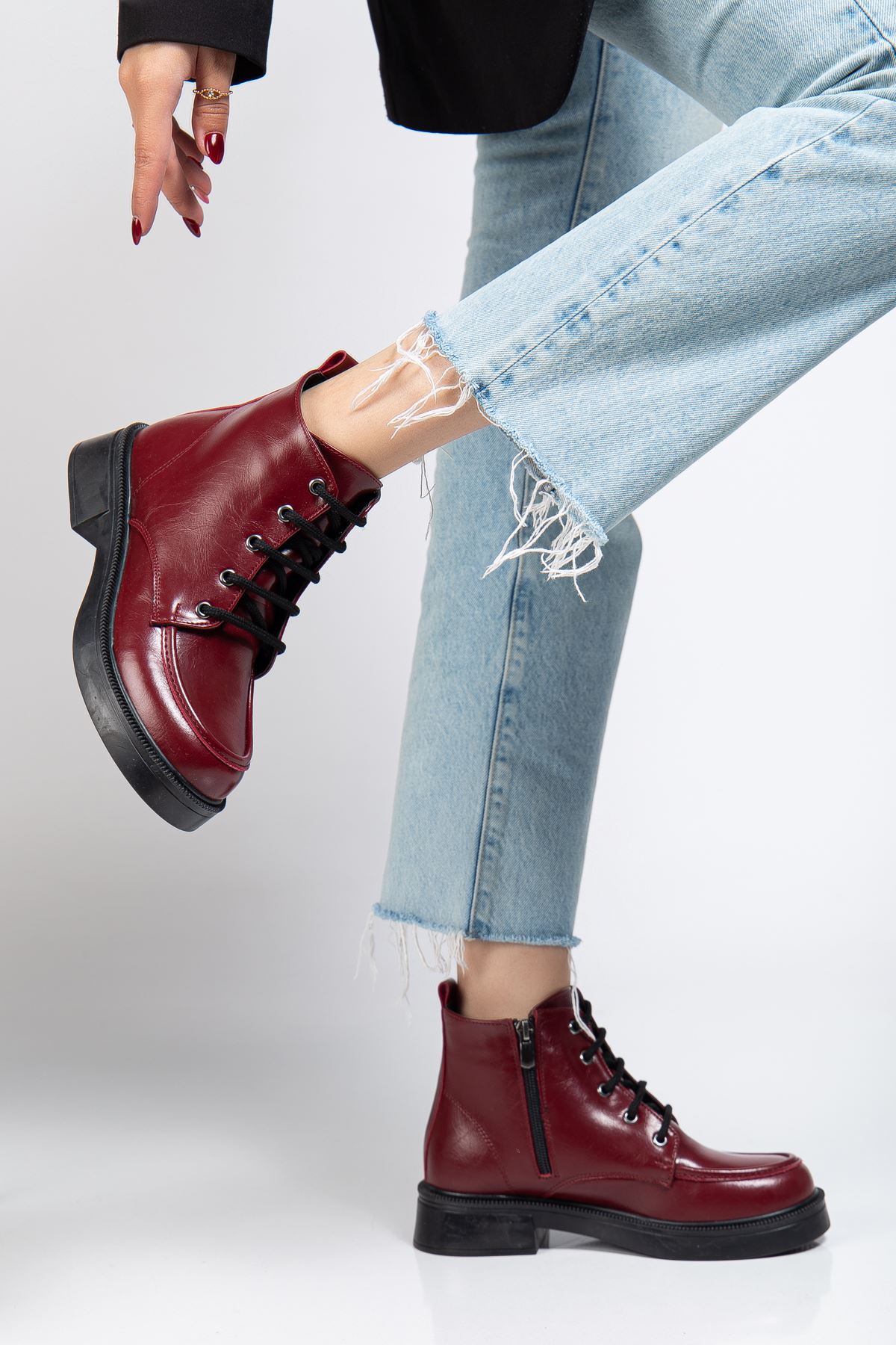 02-2001 Bordo Kırışık Rugan Bağcıklı Fermuarlı Günlük Kadın Bot