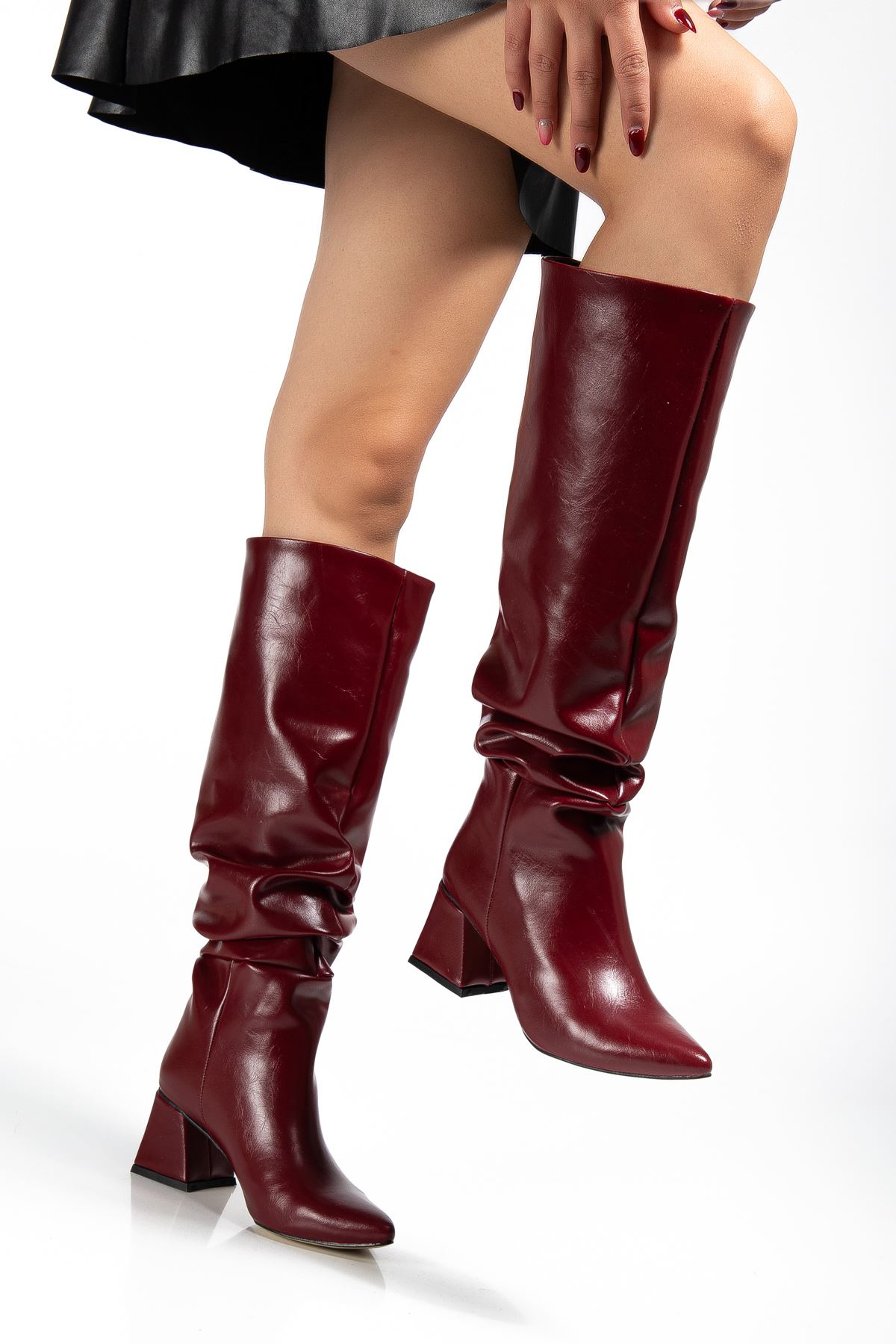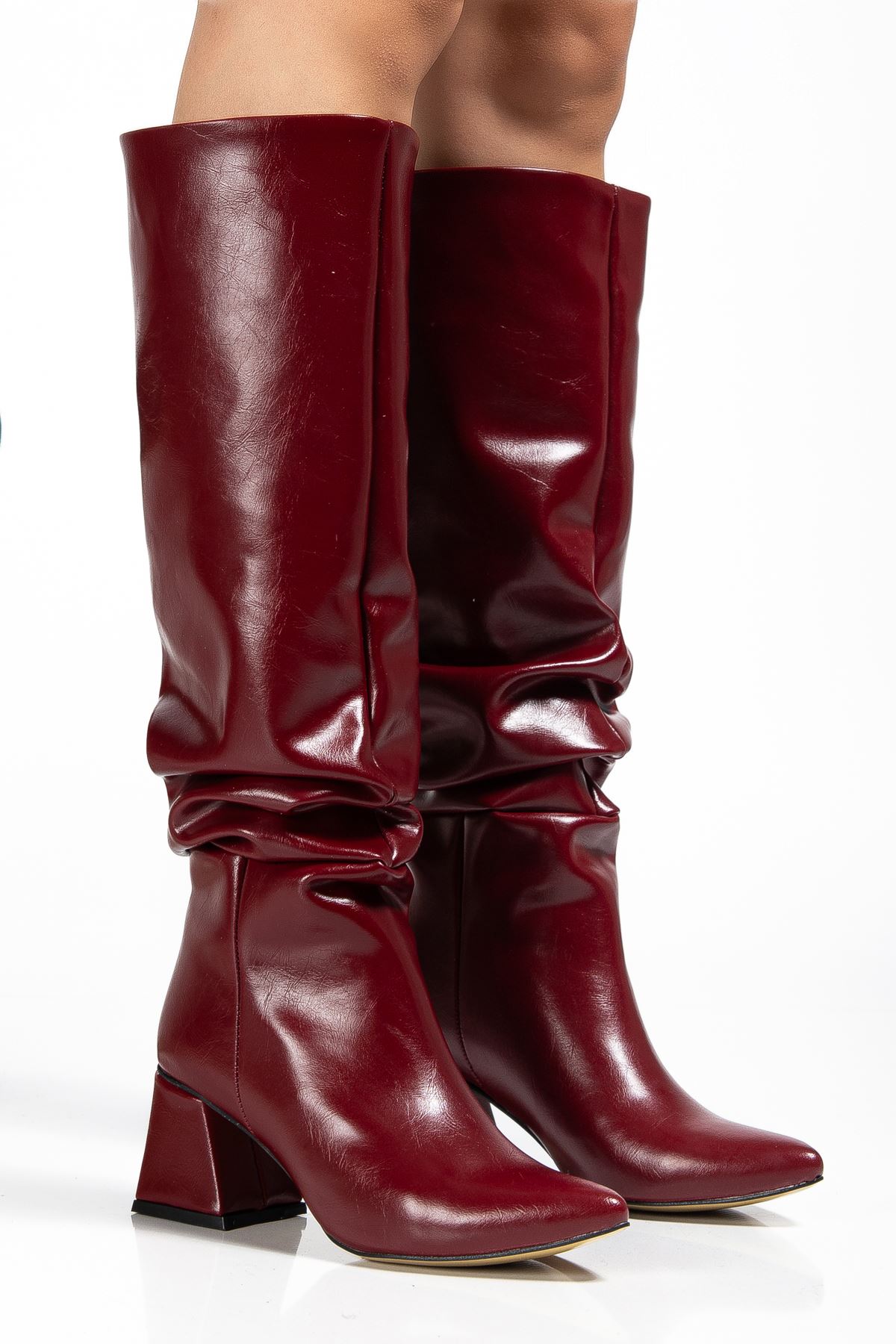 SYT-2002 Bordo Kırışık Rugan Körüklü Kalın Topuklu Günlük Bayan Çizme